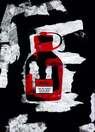 With three colours (red, white and black), the characteristic Hugo Boss botle should be designed. I made it with different teared papers and sticked like a collage.